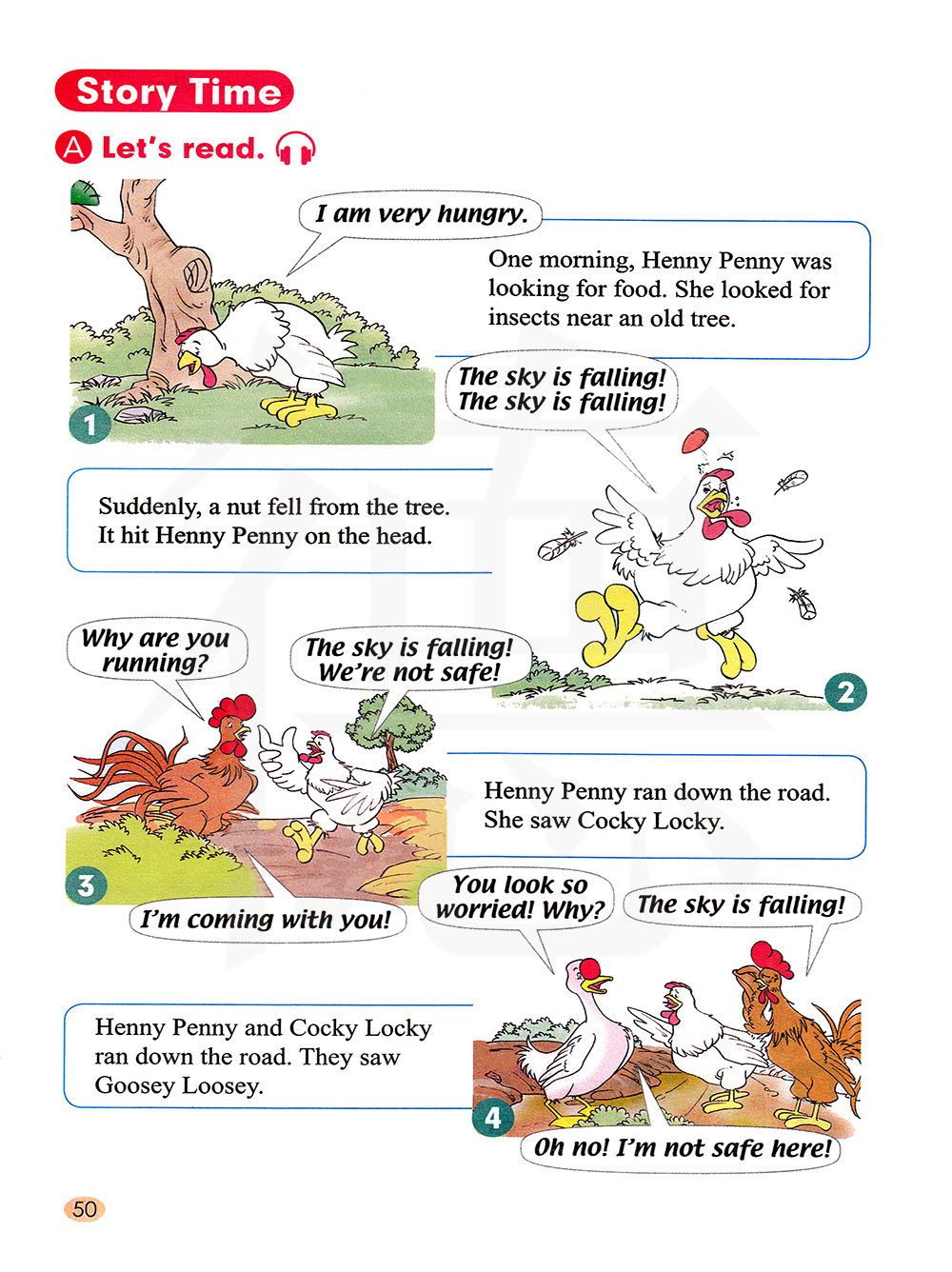 突然,一个坚果从树上掉下来。 它砸到小母鸡潘妮的头上。