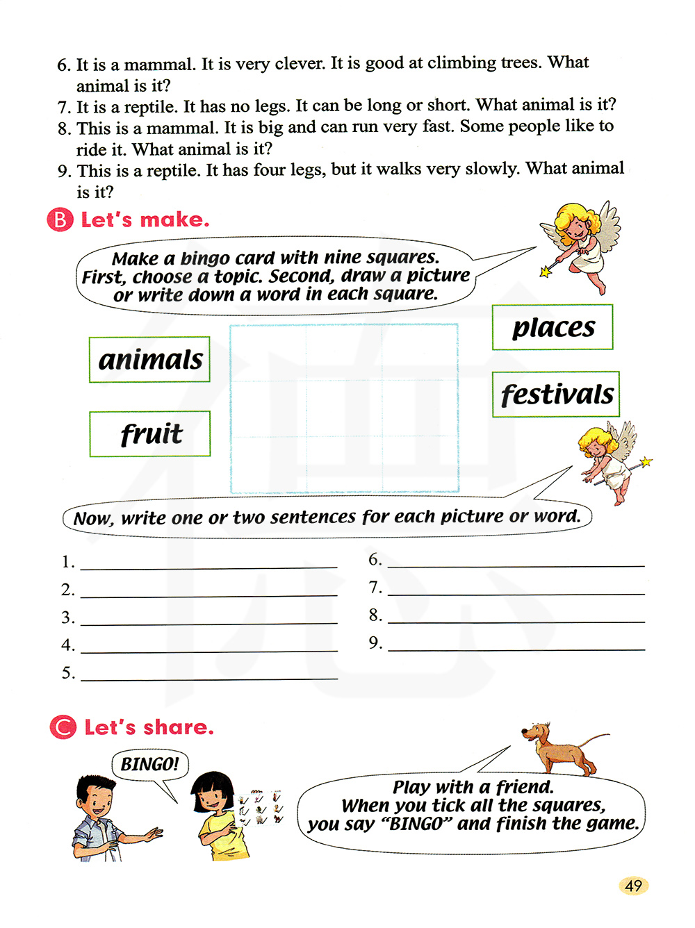 8.这是一种哺乳类动物。 它很大,可以跑得很快。 一些人喜欢骑它。 它是什么动物? 9.这是一种爬行动物。 它有四条腿, 但是走得很慢。 它是什么动物?