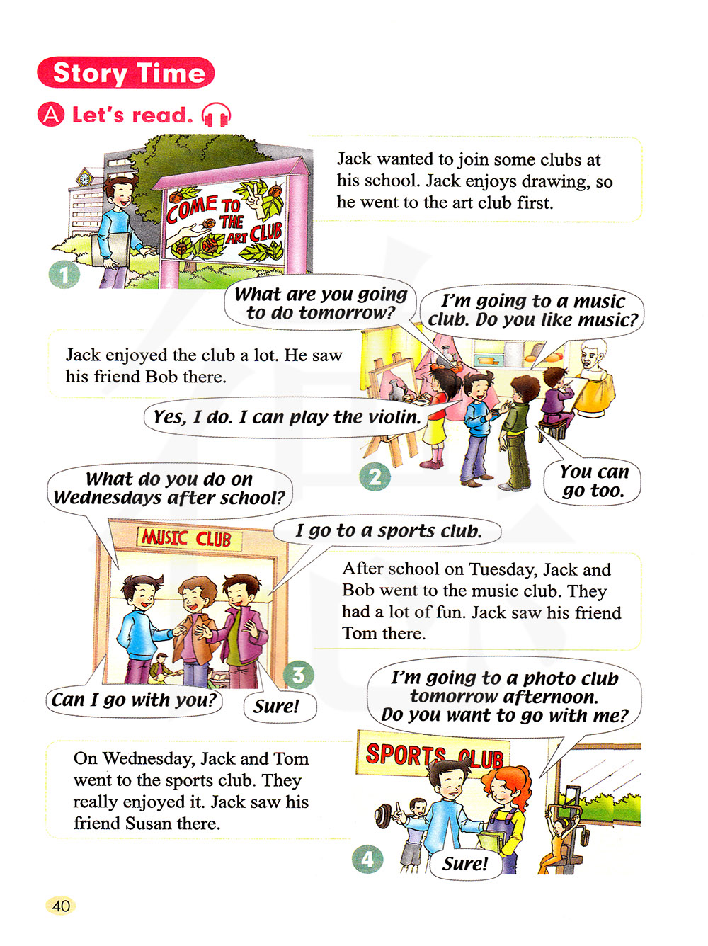 杰克想加入学校里的一些俱乐部。 杰克喜欢画画, 所以他先去了美术俱乐部。