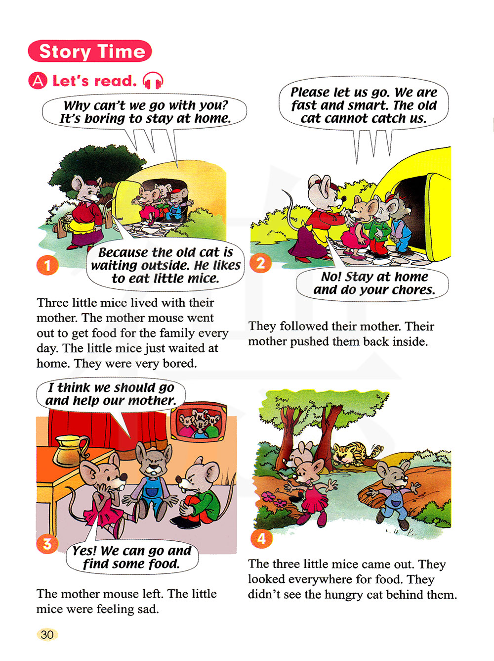 三只小老鼠和它们的妈妈生活在一起。 老鼠妈妈每天出去为一家人找食物。 小老鼠们只能在家等着。 它们很无聊。