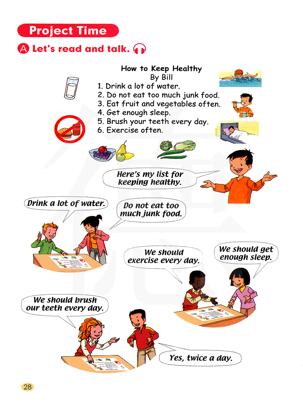 如何保持健康 作者:比尔 1.多喝水。 2.不要吃太多垃圾食品。 3.经常吃水果和蔬菜。 4.睡眠充足。 5.每天刷牙。 6.经常锻炼。
