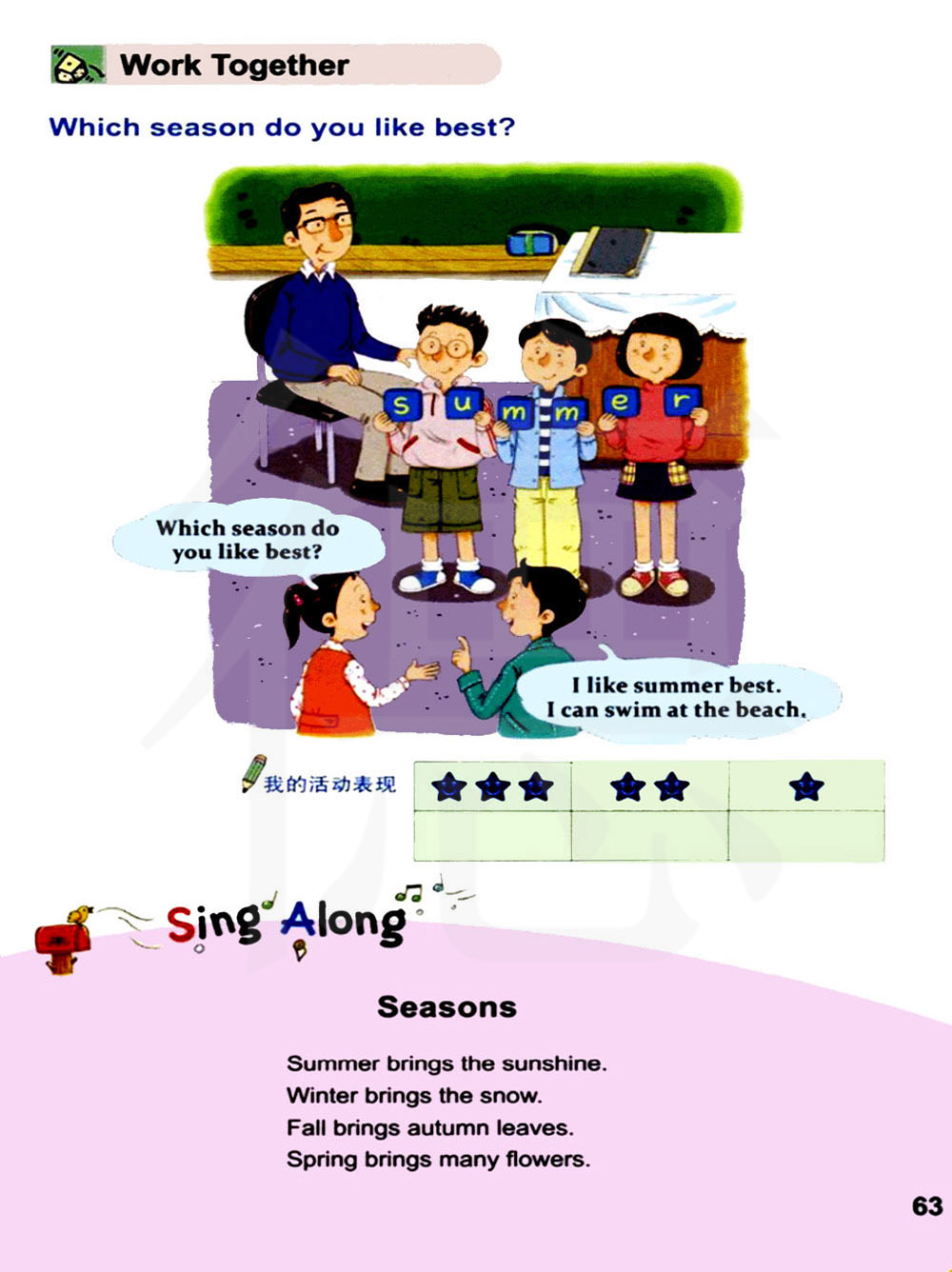我最喜欢夏天,我可以在沙滩游泳。