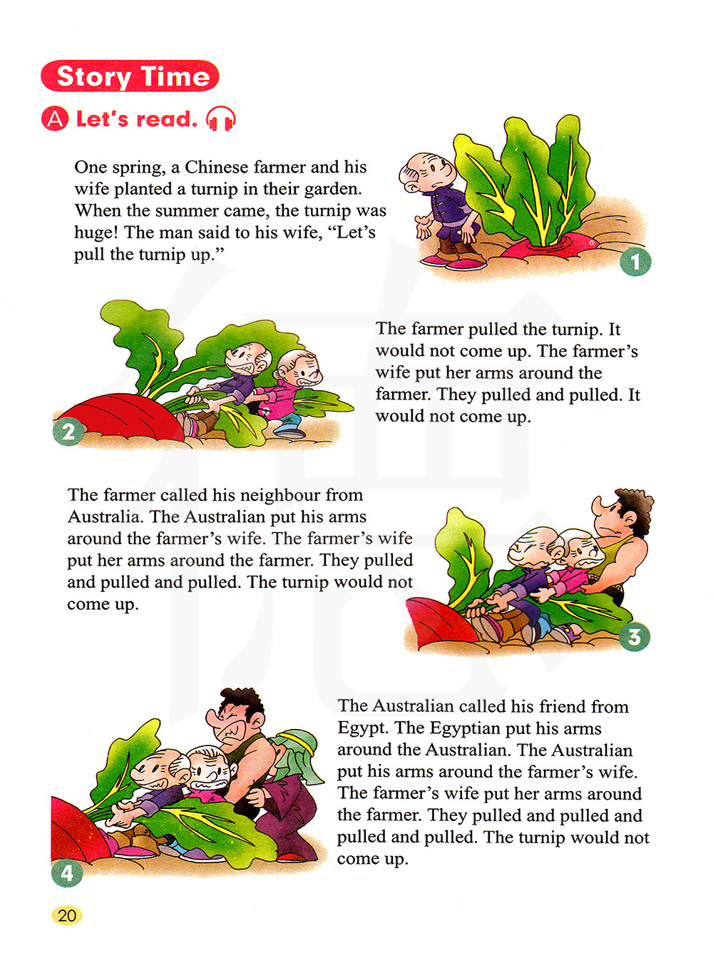 农夫把他来自澳大利亚的邻居喊来。 那个澳大利亚人用他的双臂抱着农夫的妻子的腰。 农夫的妻子用她的双臂抱着农夫的腰。 他们拔呀拔呀拔。 萝卜还是没有拔出来。