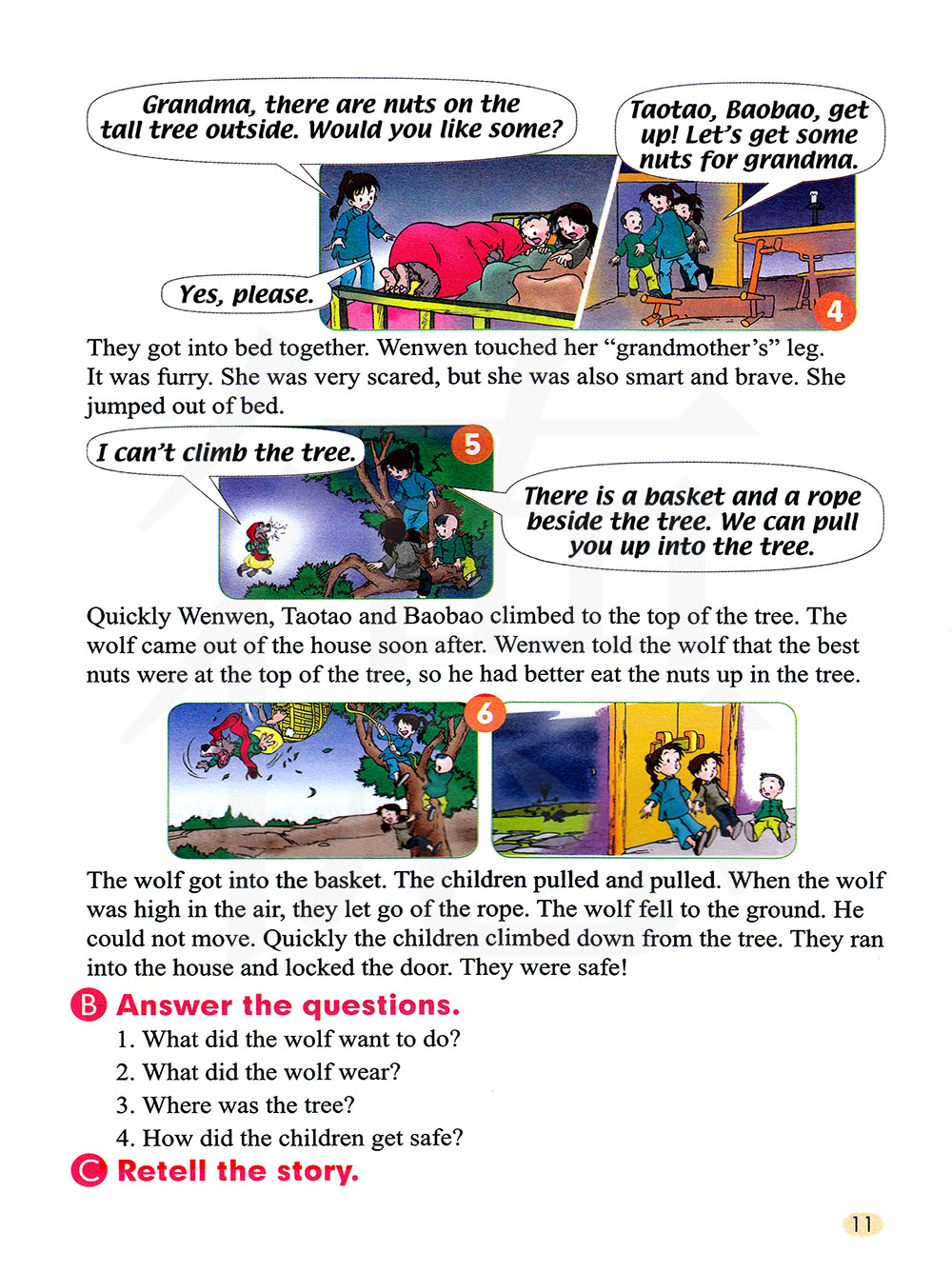 狼进到篮子里。 孩子们拉啊拉。 当狼在空中的时候, 孩子们松开绳子。 狼掉到地上,动不了了。 孩子们很快地从树上爬下来。 他们跑进房子里,锁上门。 他们安全了!