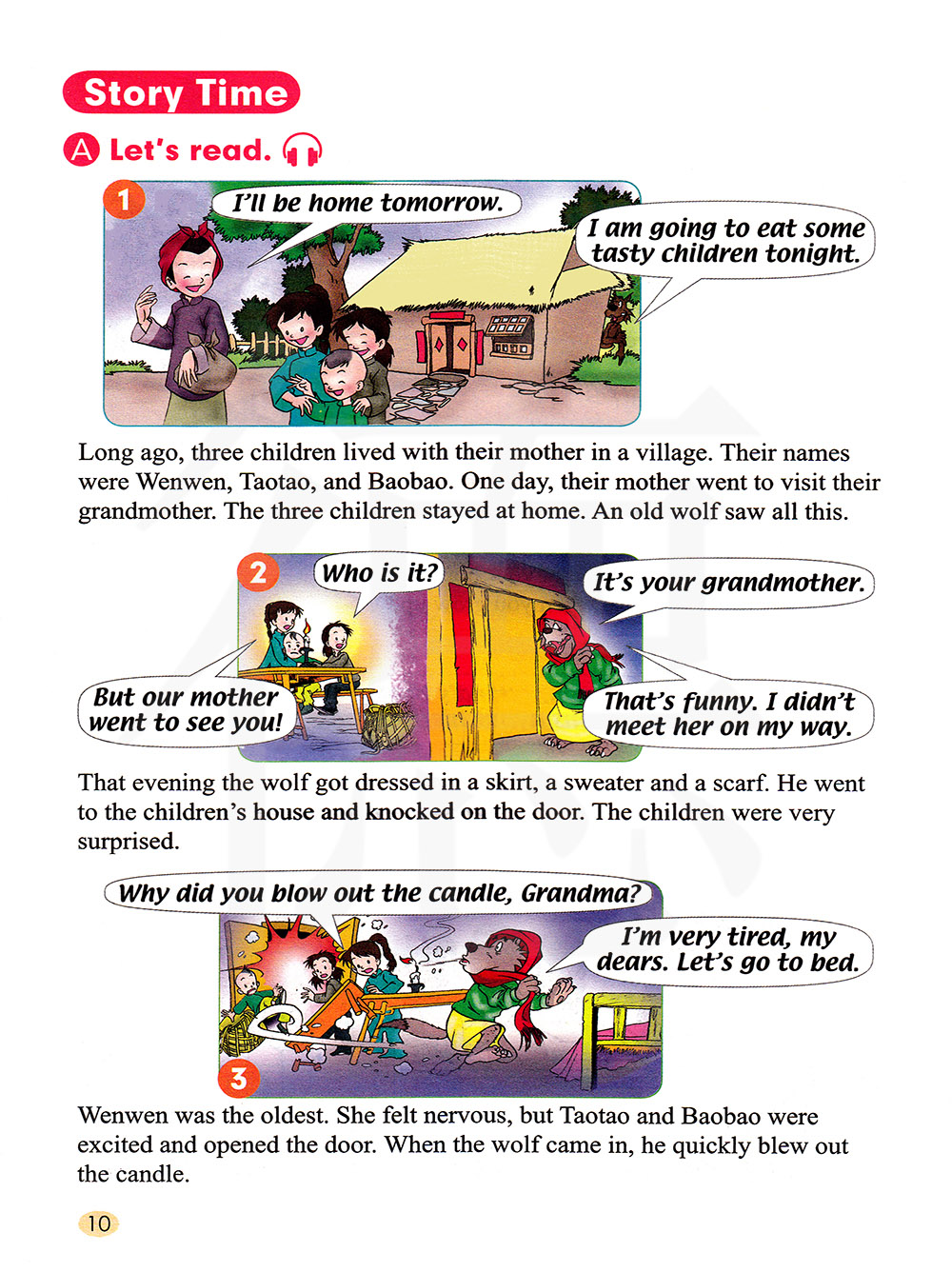 雯雯是最大的孩子。 她感到紧张, 但是涛涛和宝宝很兴奋,他们打开门。 狼进来的时候, 快速地把蜡烛吹灭了。