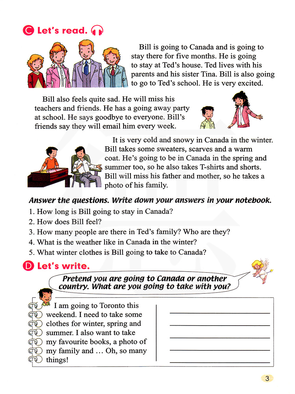 加拿大的冬天很冷,而且多雪。 比尔带了几件毛衣、围巾和一件保暖大衣。 春天和夏天他还会在加拿大, 因此他还带了几件T恤衫和几条短裤。 比尔会想念他的爸爸妈妈, 于是他带了一张全家福。