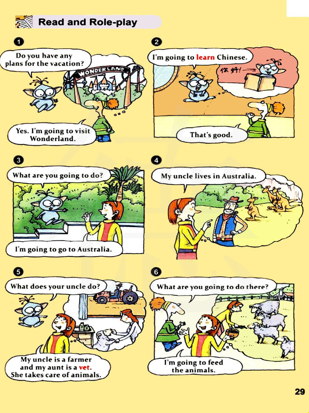 我叔叔是农民,我婶婶是兽医。 她照看动物们。