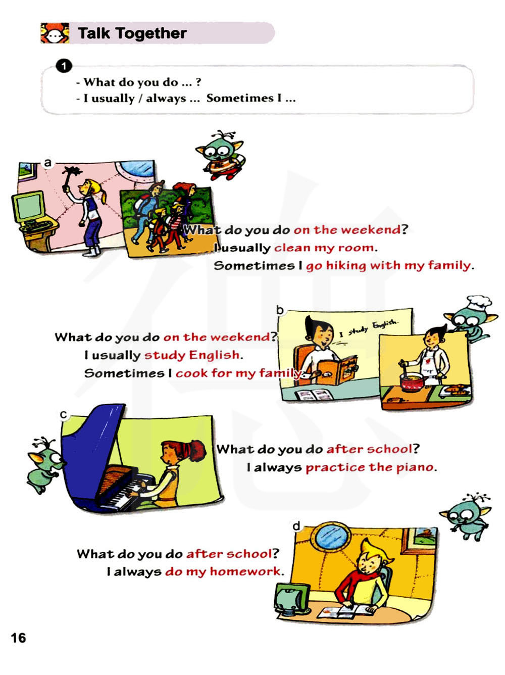 你在周末干什么? 我通常打扫我的房间。 有时我跟我的家人去徒步旅行。