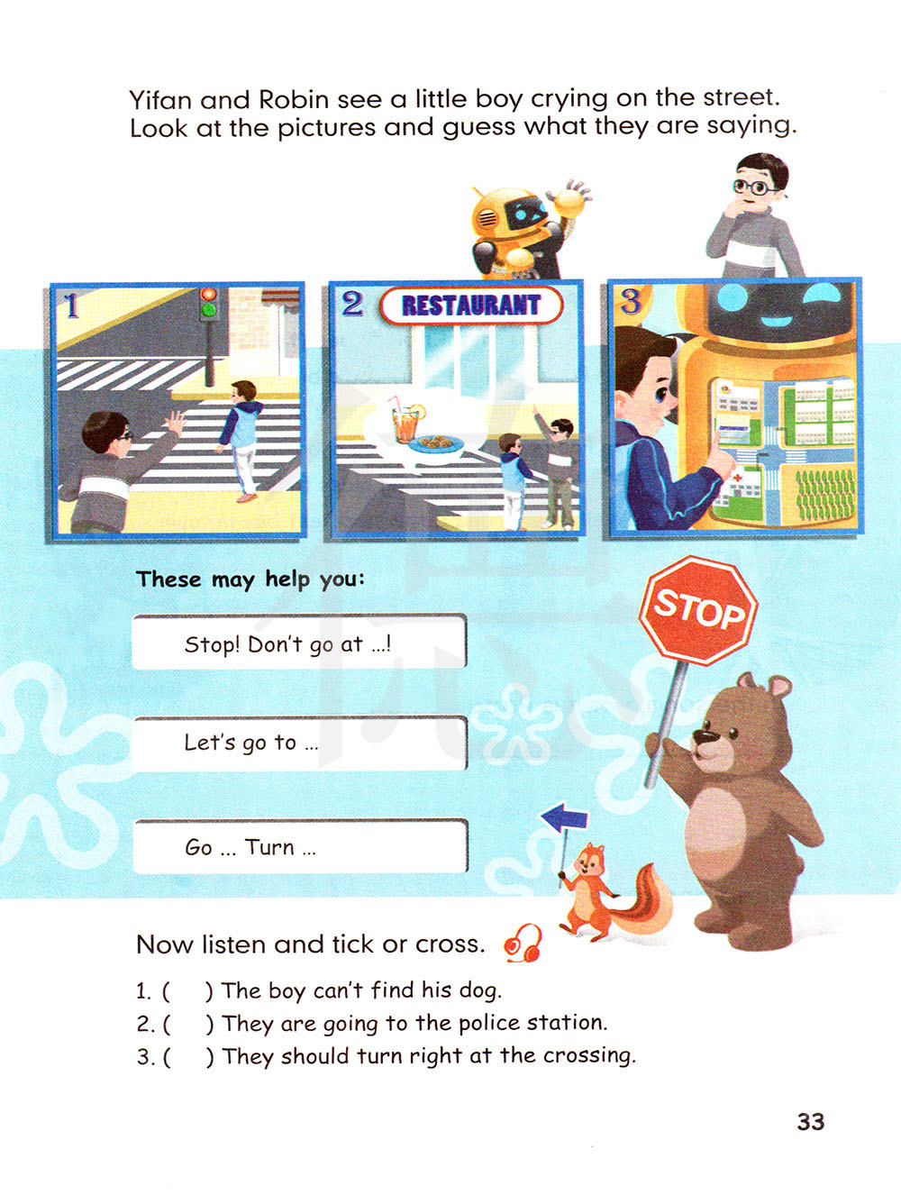 一凡和罗宾看到一个小男孩在街上哭。看这些图片并猜一猜他们在说什么?