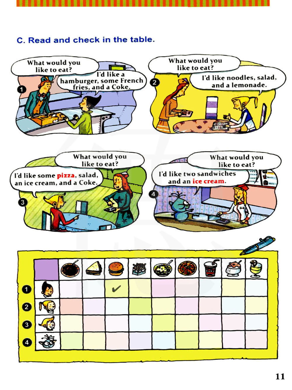 我想要一些比萨饼,沙拉,一个冰淇淋和一些可乐。