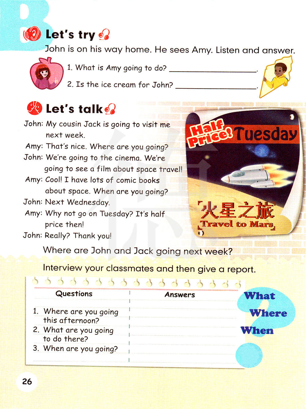 约翰在他回家的路上。他看见了艾米,听一听并回答。