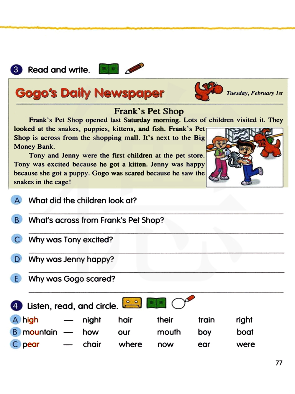 托尼和詹妮是第一批进入宠物商店的孩子。托尼很兴奋,因为他看到了一只小猫。詹妮很开心,因为她看到了一只小狗。戈高很害怕,因为他看见了笼子里的蛇!