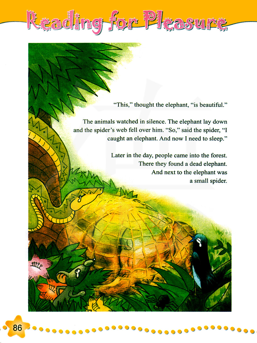动物们都沉默的看着。大象躺了下来,蜘蛛的网落在了他身上。“那么,”蜘蛛说,“我捉到了一头大象,现在我要去睡觉了。”