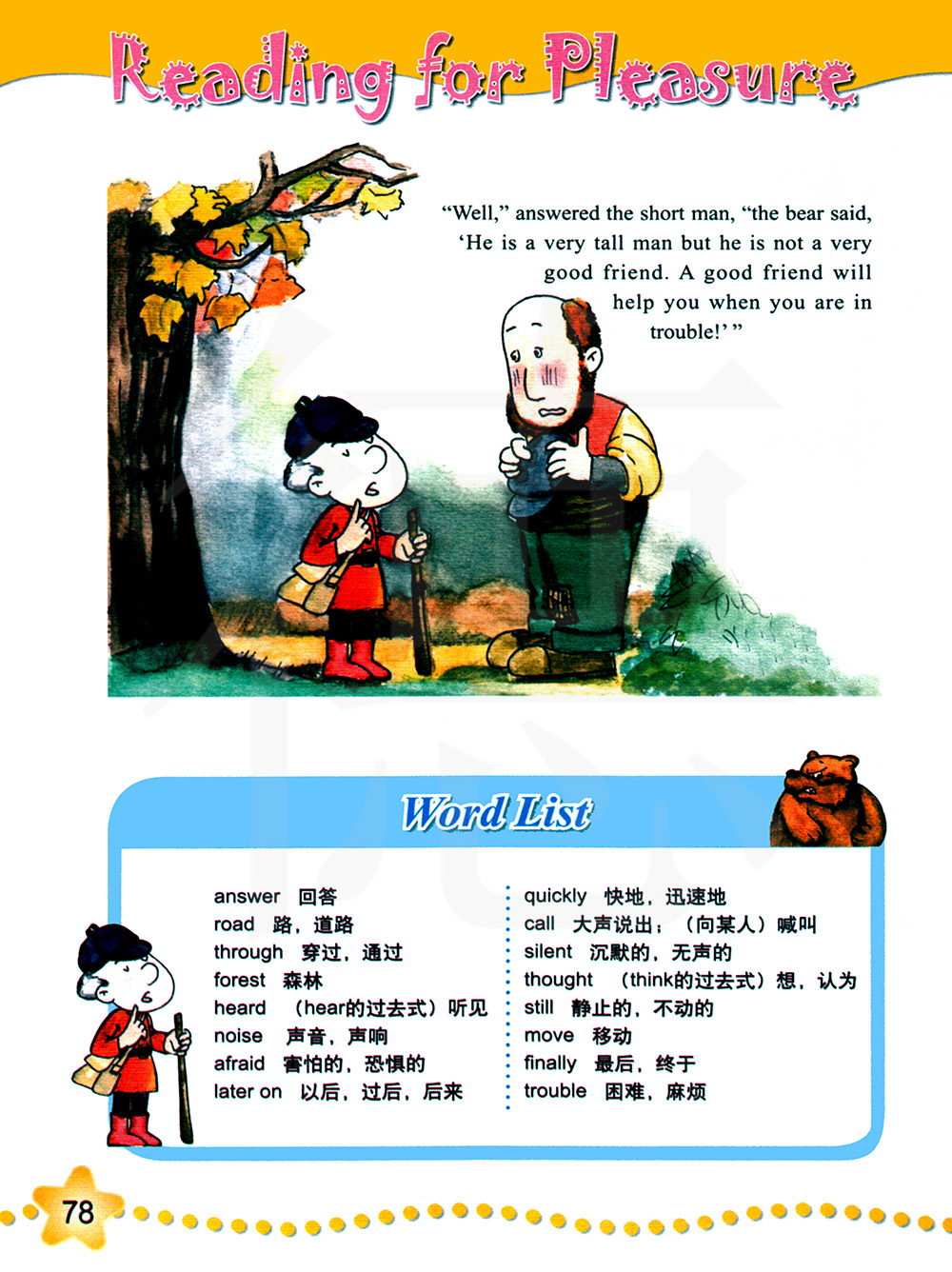 “嗯,”矮个男人回答道:“熊说,他是一个很高的人,但是不是一个很好的朋友。好朋友在你有困难的时候会帮助你!”