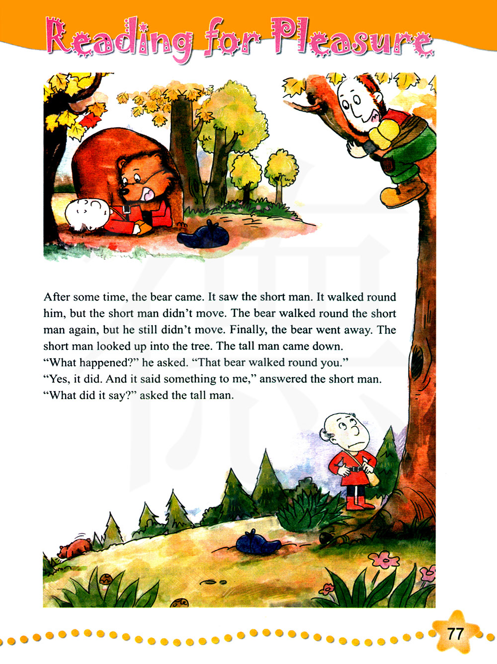 不久之后,熊来了。熊看见了矮个男人。熊在矮个男人身边走了一圈,但是他没有移动。熊又在矮个男人身边走了一圈,但是他还是没有移动。最终熊离开了。矮个男人往树上看了看。高个男人下来了。