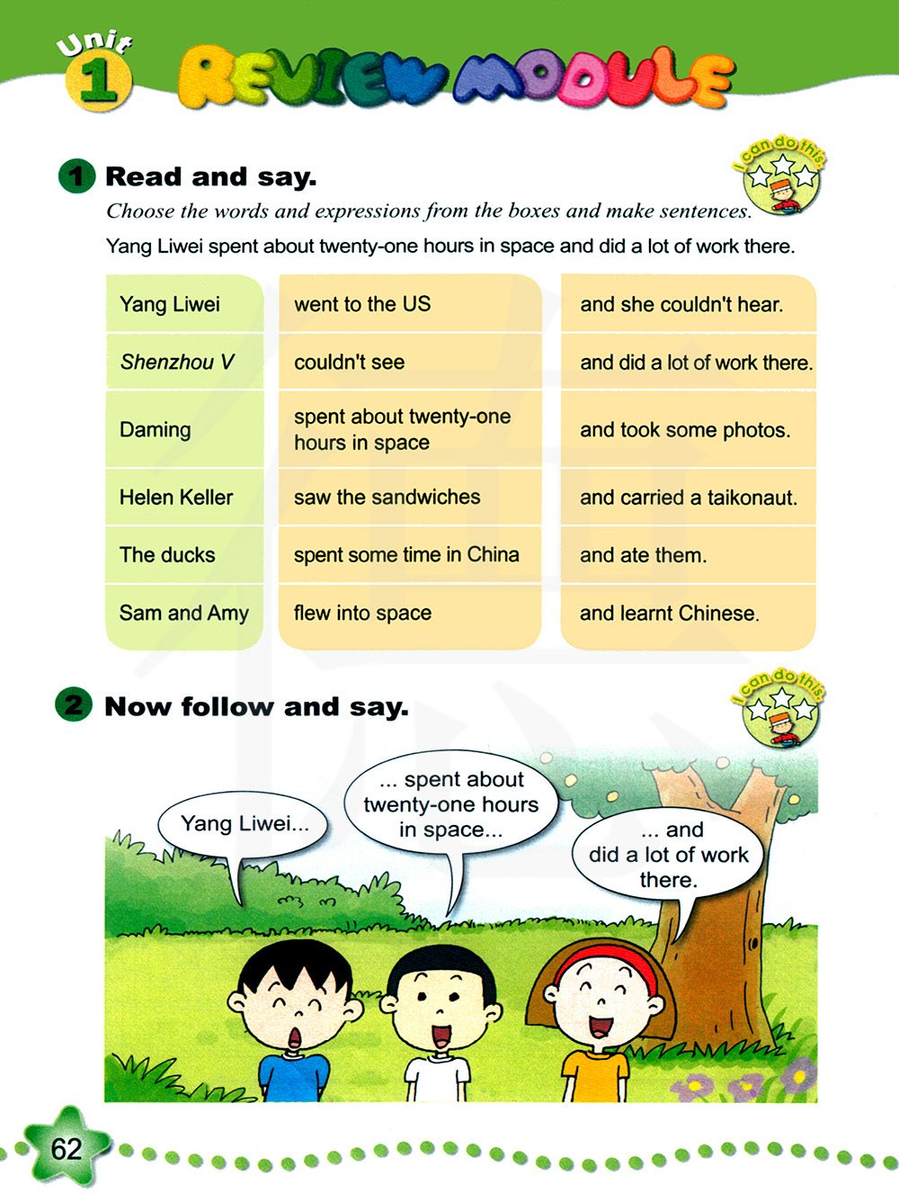 从方框里选择单词和词组造句。 杨利伟在太空度过了大约21小时,并在那里完成了很多工作。