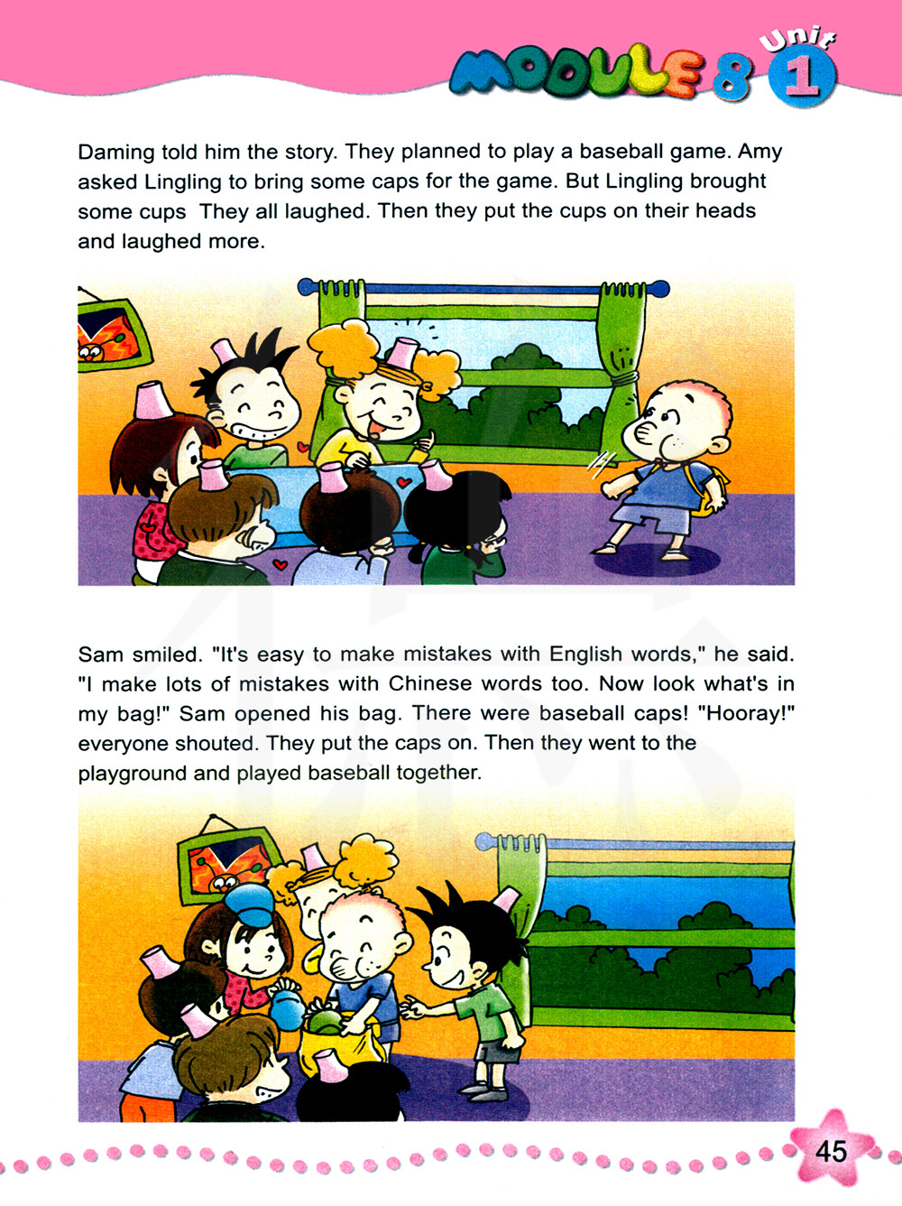 萨姆笑了。英语单词很容易犯错,他说,我在汉字方面也犯了很多错误。现在看看我书包里有什么吧。萨姆打开他的书包。里面有棒球帽!万岁!大家都大喊道。他们戴上帽子,然后他们去了操场一起打棒球。