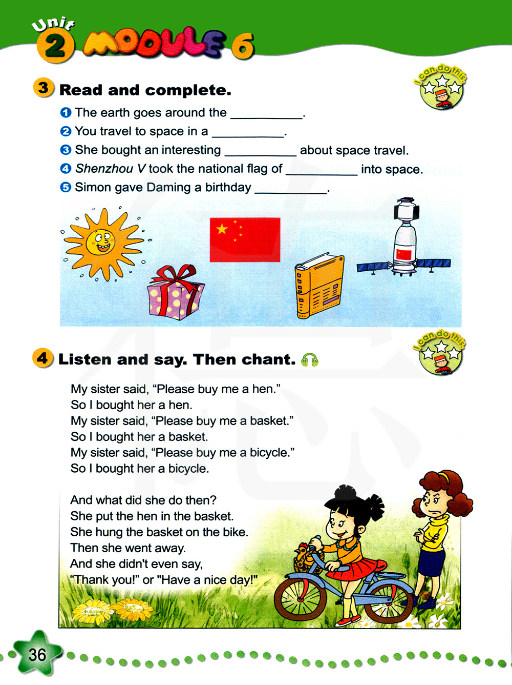 我的妹妹说;“请给我一只母鸡。”所以我给她买了一只母鸡。我的妹妹说:“请给我买一个篮子。”所以我给她买了一个篮子。我的妹妹说:“请给我买一辆自行车。”所以我给她买了一辆自行车。之后她做了什么?她把母鸡放在篮子里。她把篮子挂在自行车上。然后她离开了。她甚至没有说:“谢谢!”或者是“祝你今天愉快!”