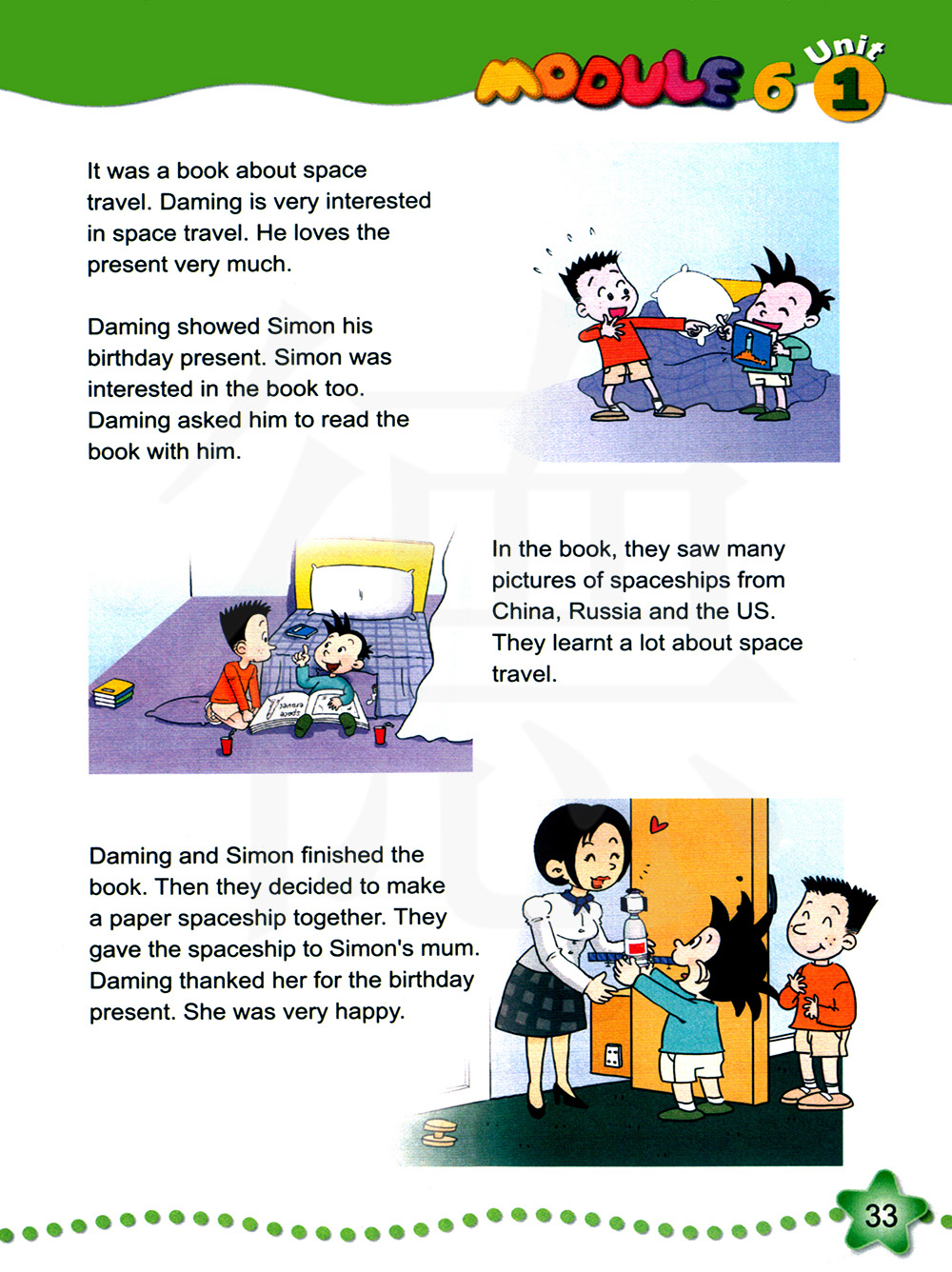 大明和西蒙看完了这本书。然后他们决定一起做一个纸质的宇宙飞船。他们把这个宇宙飞船给了西蒙的妈妈。大明感谢她送给他这份生日礼物。她非常开心。