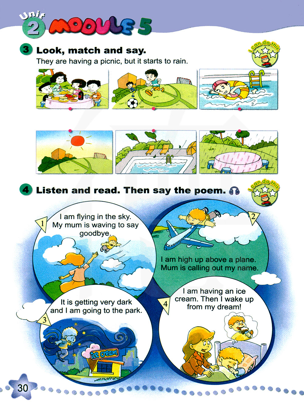 我正在天空飞翔。我的妈妈在挥手说再见。我飞得很高,高过一架飞机。妈妈正在呼叫我的名字。天变得很黑,我正往公园飞去。我正在吃冰激凌。然后我从梦里醒来!