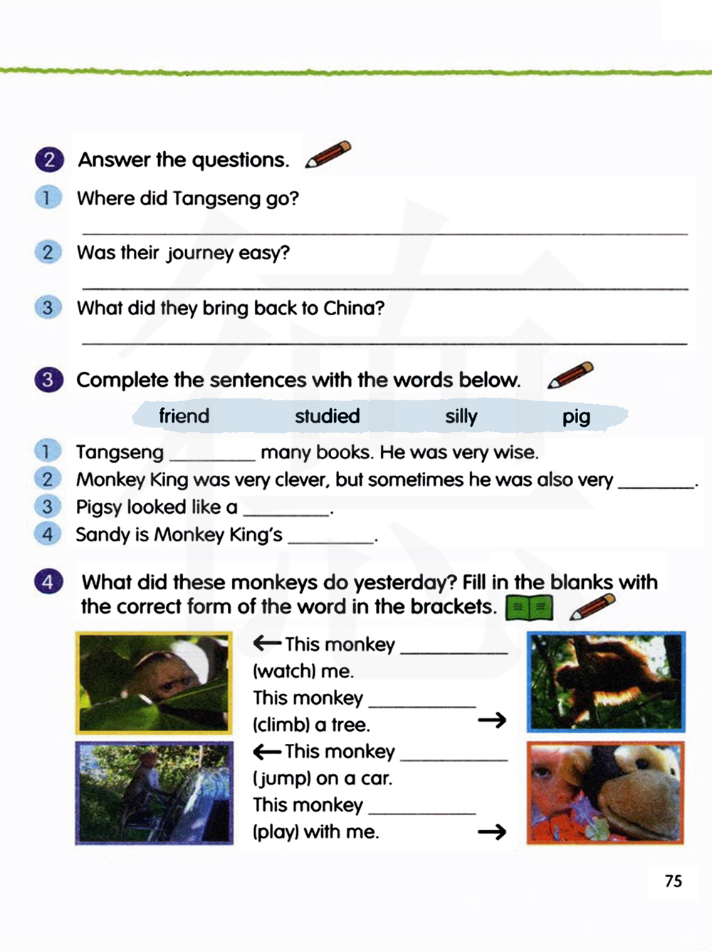 这些猴子昨天做了什么?用括号里单词的正确形式填空。