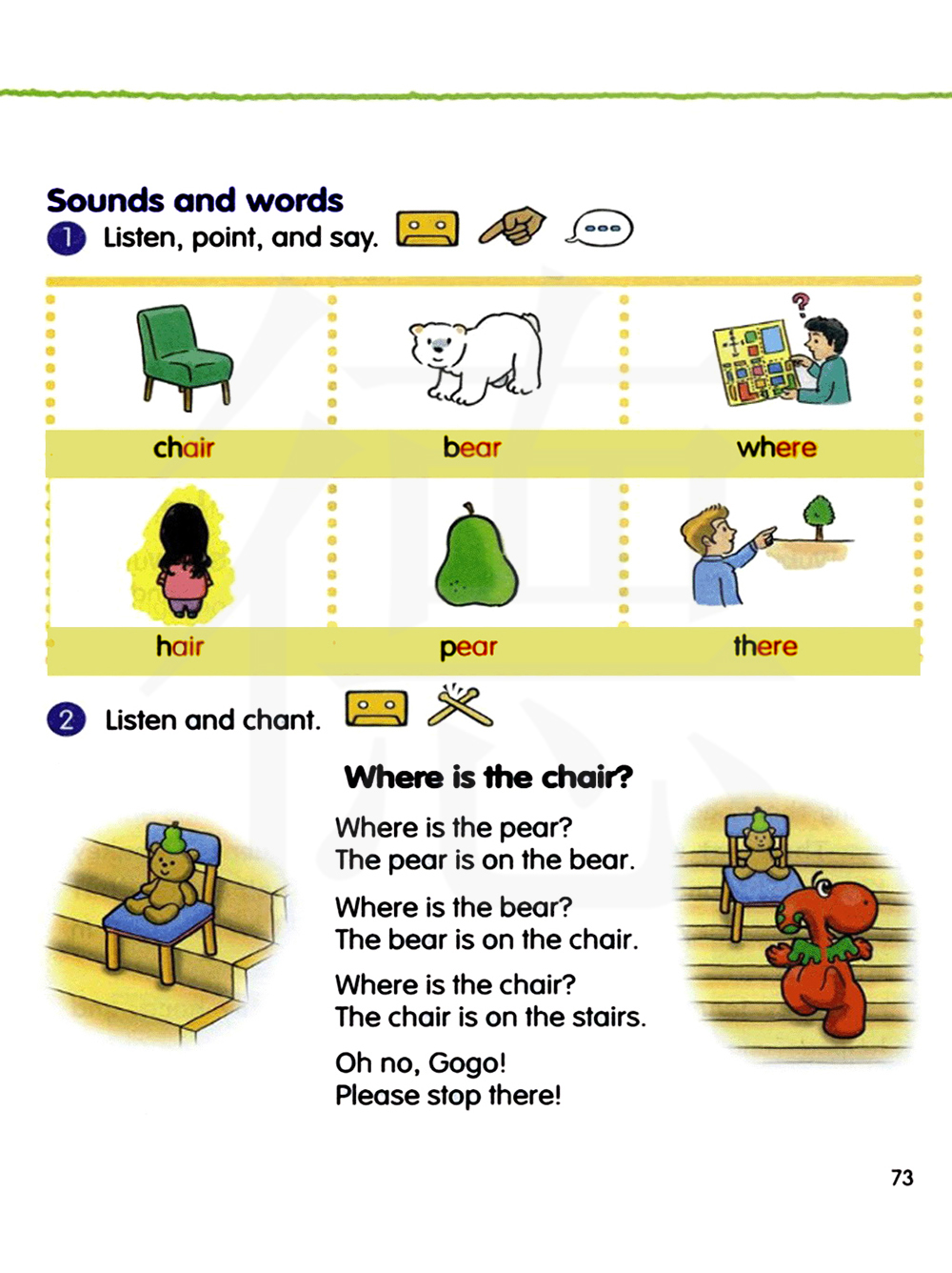 梨在哪里?梨在熊头上。熊在哪里?熊在椅子上。椅子在哪里?椅子在楼梯上。哦不,Gogo!请停在那里!