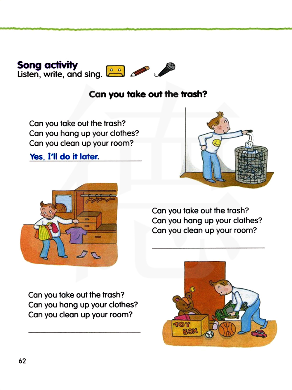 你能把垃圾拿出去吗?你能把你的衣服挂起来吗?你能打扫你的房间吗? 是的,我稍后就做。 你能把垃圾拿出去吗? 你能把你的衣服挂起来吗? 你能打扫你的房间吗? 你能把垃圾拿出去吗?你能把你的衣服挂起来吗?你能打扫你的房间吗?