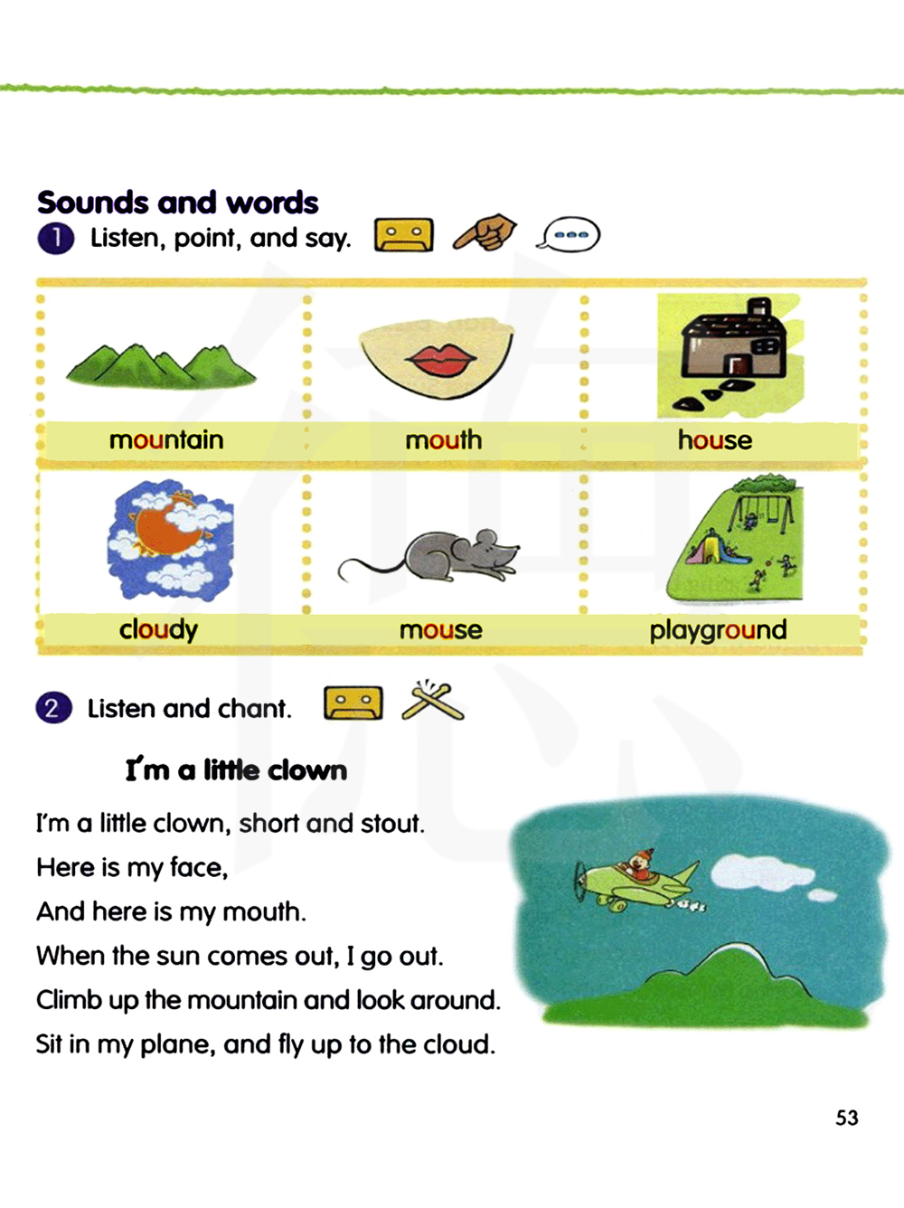 我是一个小丑,又矮又胖。 这是我的脸,这是我的嘴。 太阳出来,我出去。 爬上山看看周围。乘着我的飞机,飞到云端。