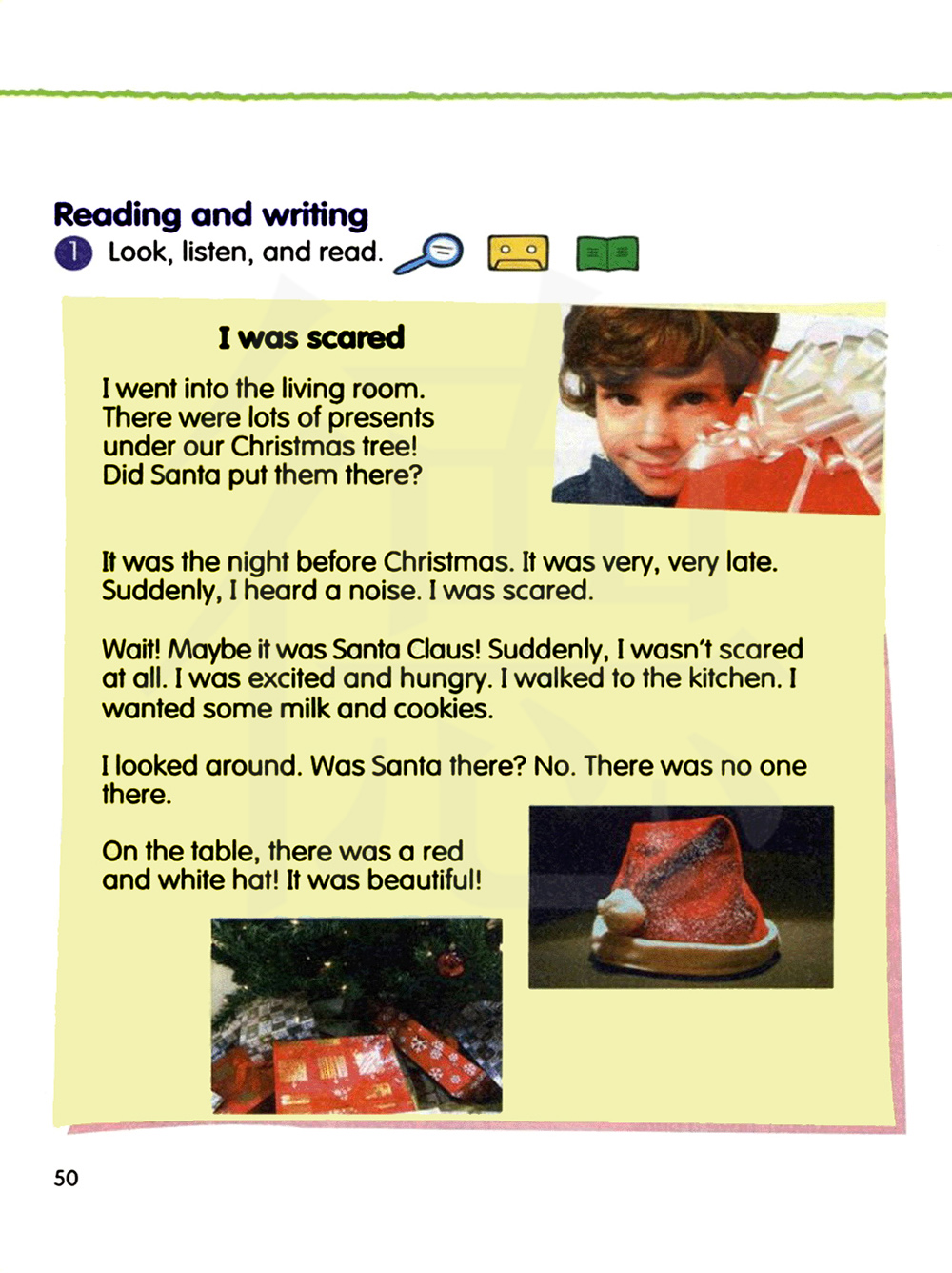 等等!也许它是圣诞老人! 突然,我一点也不害怕了。我很兴奋,我饿了。 我走到厨房。我想要一些牛奶和饼干。