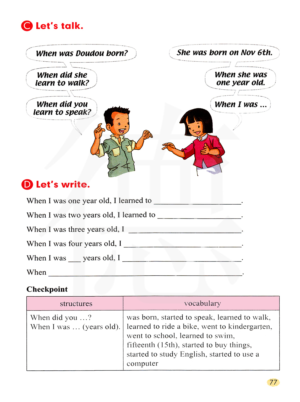 词汇 (过去式)出生, (过去式)开始说话 (过去式)学走路 (过去式)学骑自行车 (过去式)上幼儿园 (过去式)上学 (过去式)学游泳 第十五 (过去式)开始学买东西 (过去式)开始学英语 (过去式)开始使用电