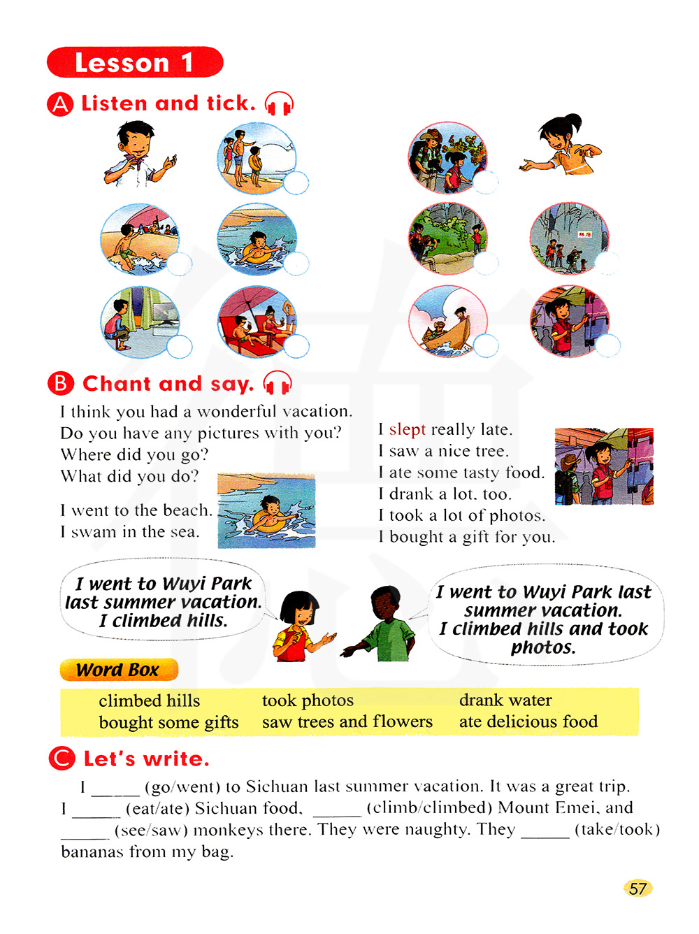 我觉得你过了一个开心的假日。 你有照片吗? 你去了哪儿? 你做了什么?我去了海滩。 我在海里游泳,我睡得很晚。 我看见一棵美丽的树。 我吃了一些美食。 我也喝了一些饮料。 我拍了很多照片。 我给你带了一件礼物。