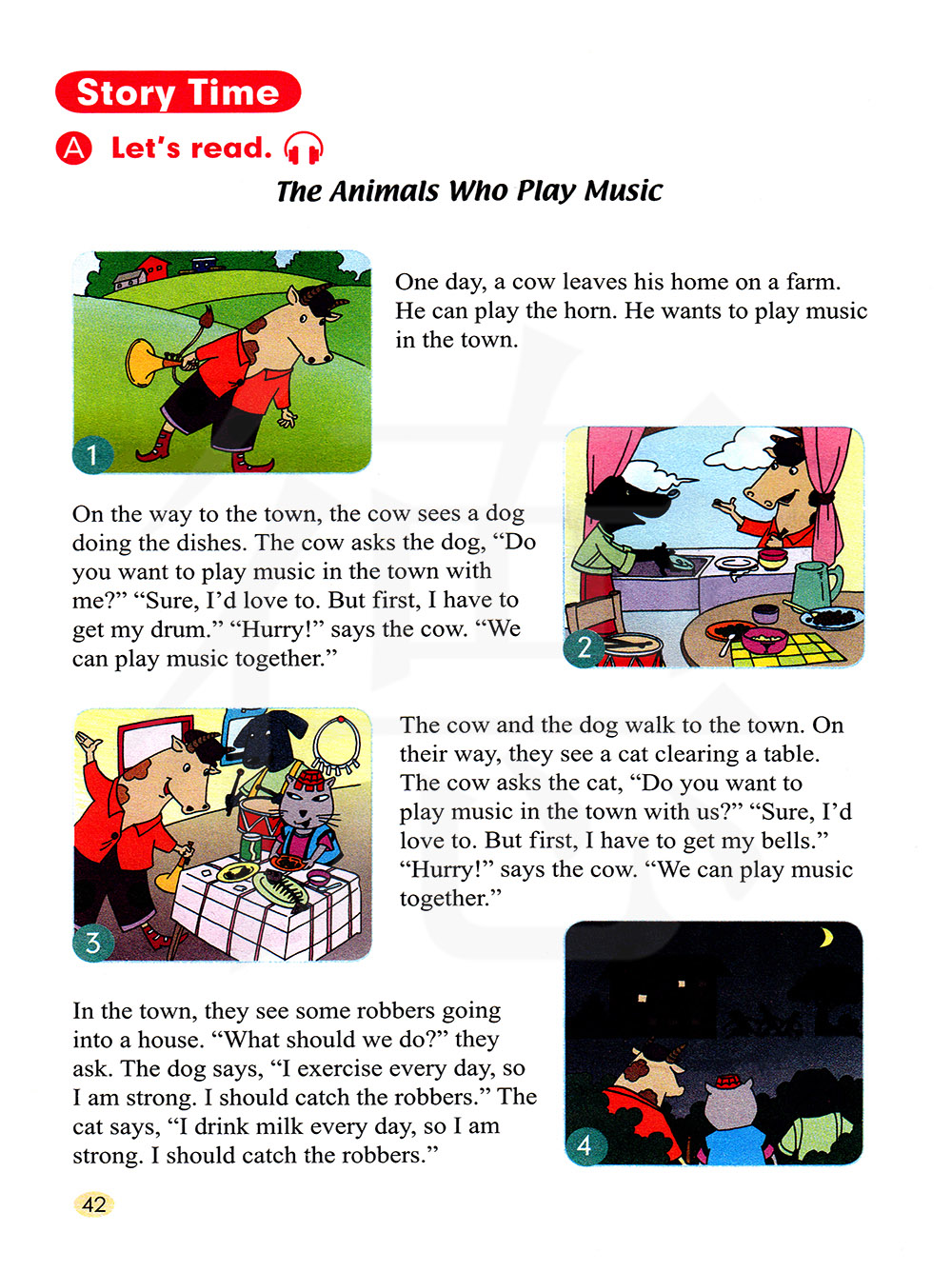 奶牛和狗一起出发去小镇。 在路上, 他们看见一只猫正在擦桌子。 奶牛问: 你愿意和我们去镇里演奏音乐吗? 当然愿意了, 但是我得拿上我的铃。 快点!奶牛说: 我们能在一起演奏音乐了。