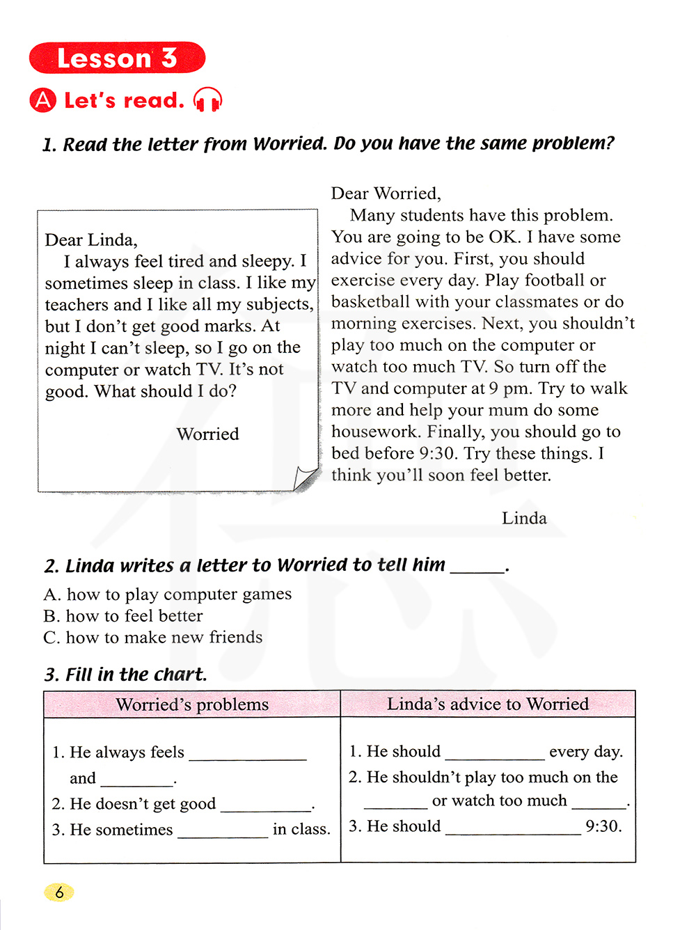 很多学生有这样的问题。 你会很快好起来的。 我要给你一些建议。 首先,你应该每天锻炼身体。 和同学们一起踢足球 或者晨练。 其次,你不应该在玩电脑 和看电视上花费太多的时间。 所以,你最好在晚上9点钟的时候就关掉电脑和电视。 你可以试着多走动走动, 或者帮助妈妈做做家务。 最后,你应该在晚上九点半前睡觉。 如果你做到这些了, 你会很快好起来的。