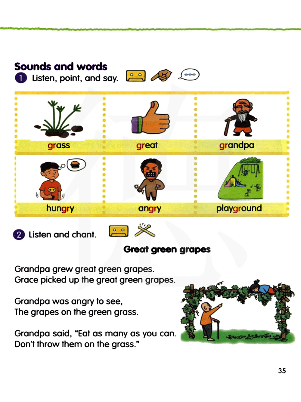 爷爷种了绿色的大葡萄。 格瑞斯采摘了绿色的大葡萄。 爷爷看到后很生气,葡萄在绿草地上。爷爷说:你吃多少摘多少,不要把它们扔到草地上。