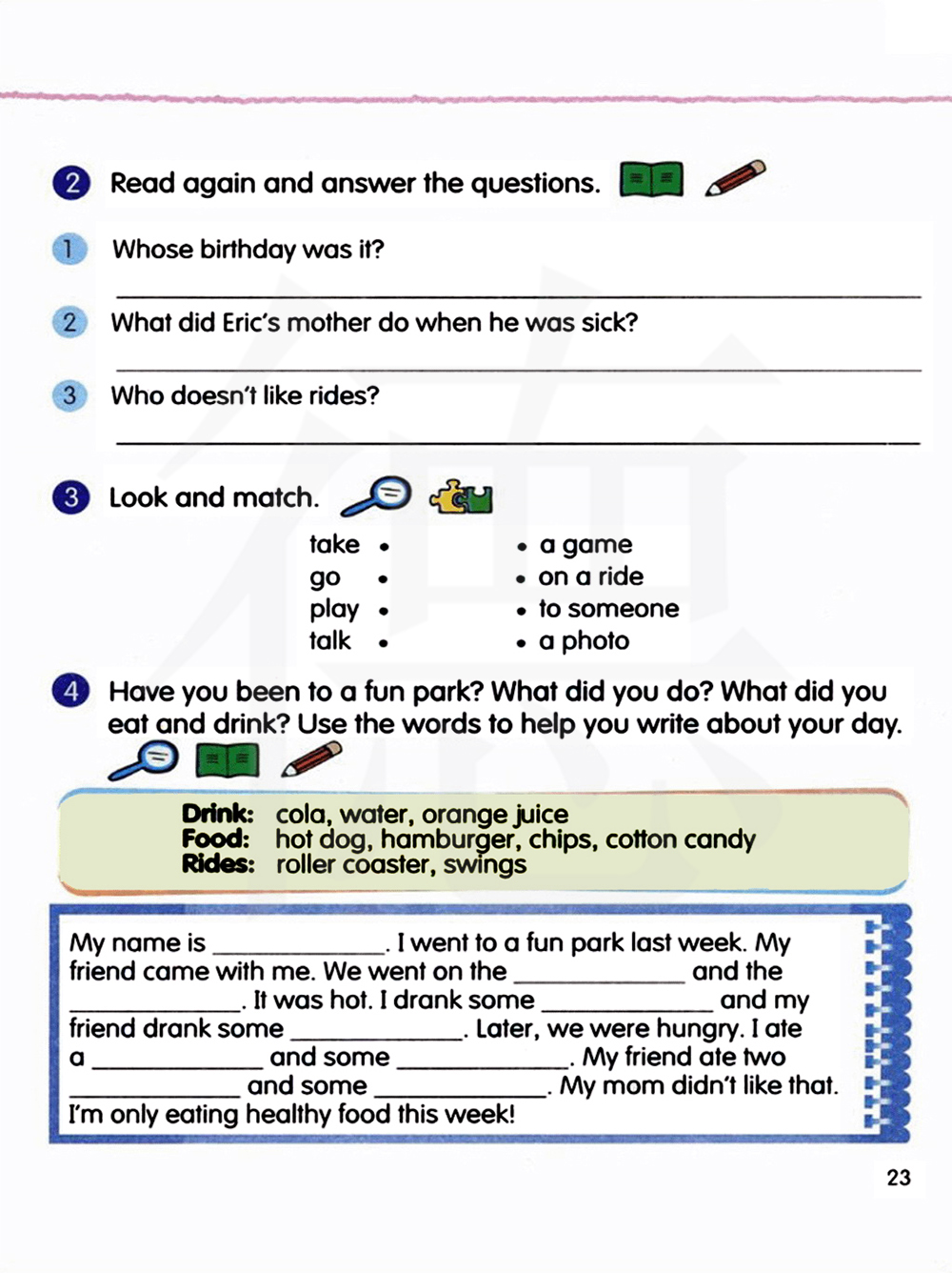 你去过游乐园吗?你做了什么?你吃了什么,喝了什么?使用这些单词帮助你写写你的一天。