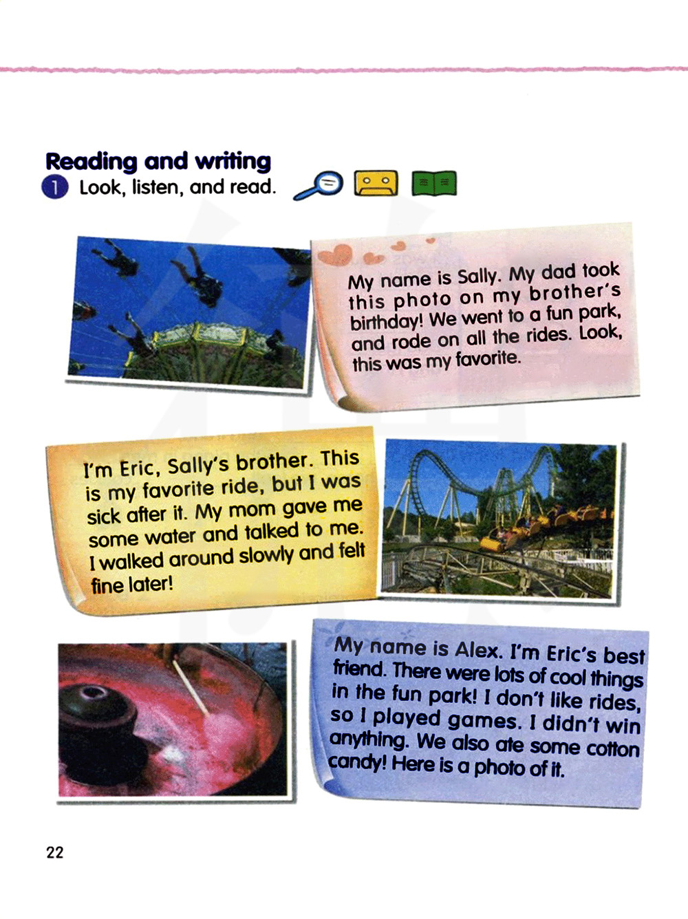 我的名字叫萨莉。这张照片是我爸爸在我弟弟生日那天拍的!我们去了一个娱乐公园,骑了所有的游乐设施。看,这是我最喜欢的。