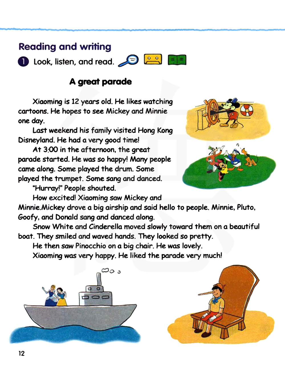 小明12岁了。他喜欢看卡通片。他希望有一天能看到米奇和米妮。