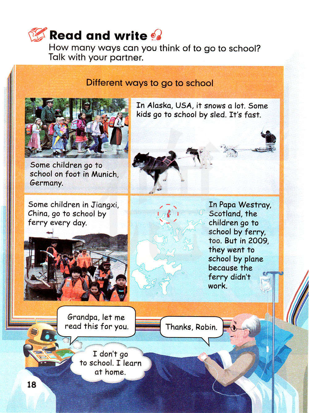 你能想到多少种去学校的方式?和你的搭档谈论。