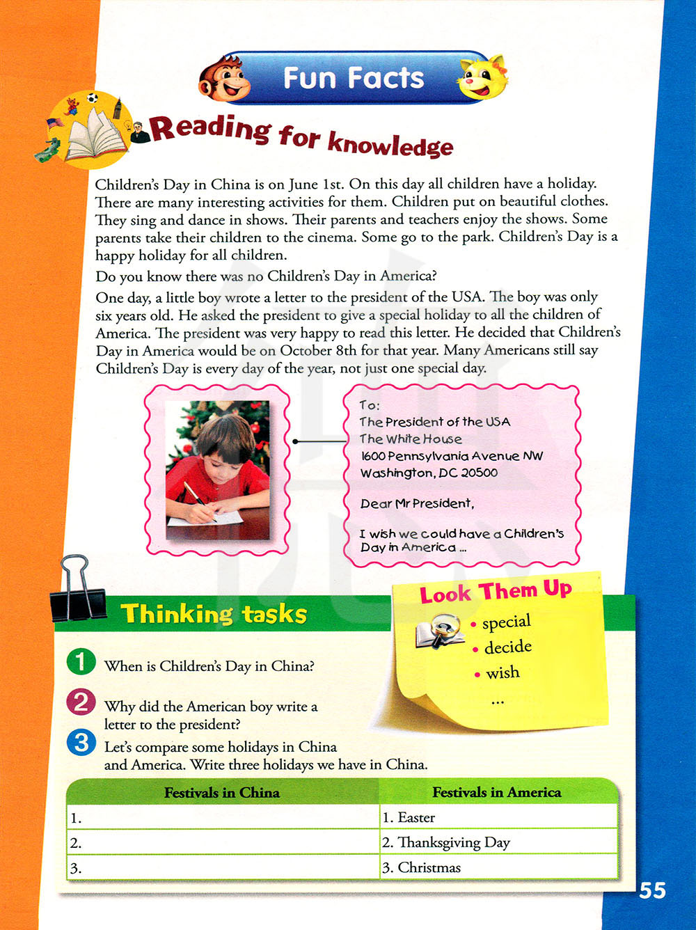 一天,一个小男孩给美国总统写了一封信。那个男孩只有六岁。他请求总统给美国所有的孩子一个特殊的假期。总统很高兴的读了他的信。他决定美国的儿童节将会在那一年的十月八日。很多美国人仍然说儿童节是一年中的每一天,而不仅仅是特殊的一天。