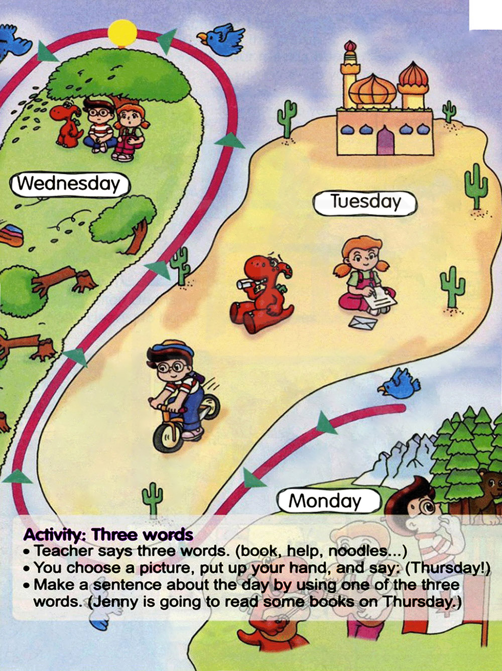 老师说三个单词。(书,帮助,面条...) 你选择一张图片,举办说:(星期四) 用三个单词中的一个完成描述那一天的句子。(星期四詹妮打算看书。)