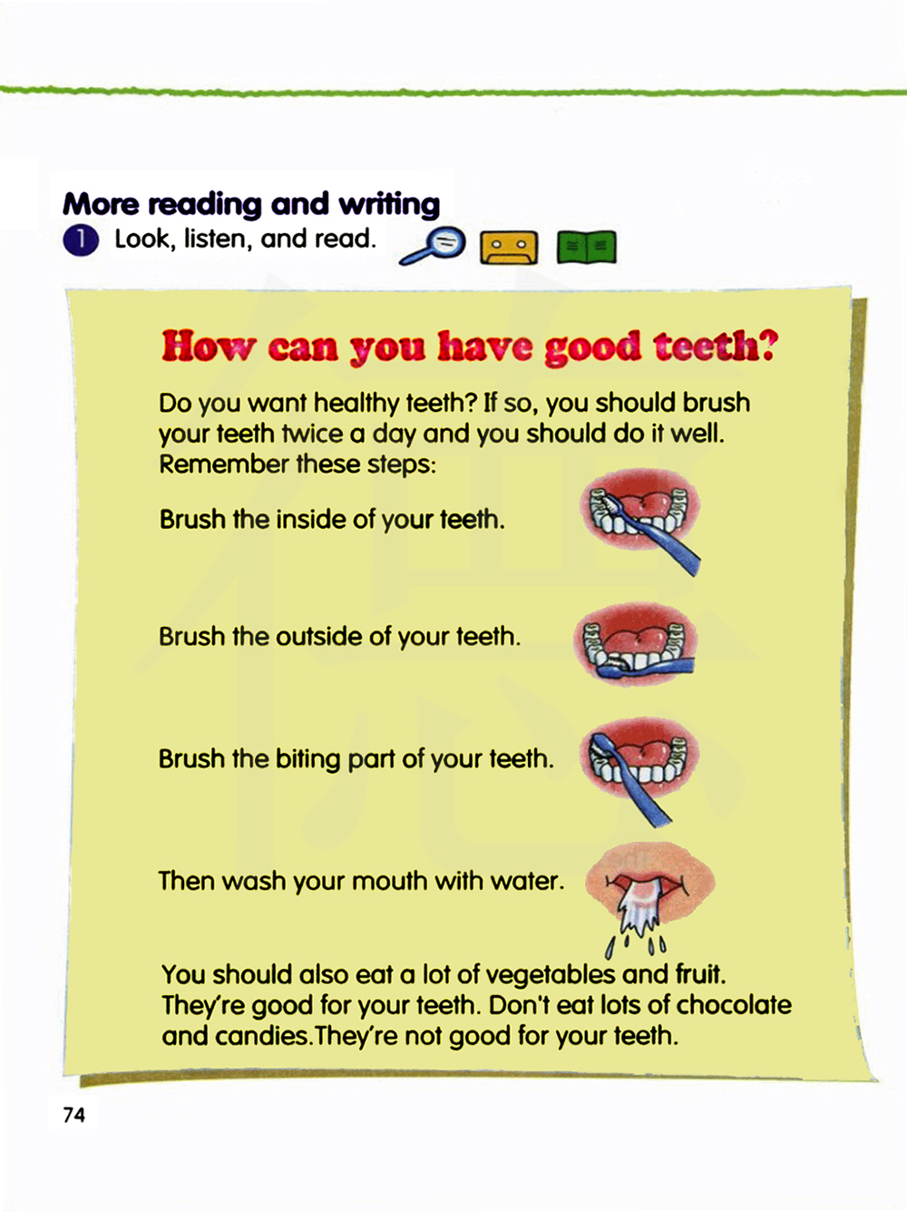 你也应该吃大量的蔬菜和水果。 它们对你的牙齿很有好处。 不要吃太多的巧克力和糖果。 它们对你的牙齿不利。