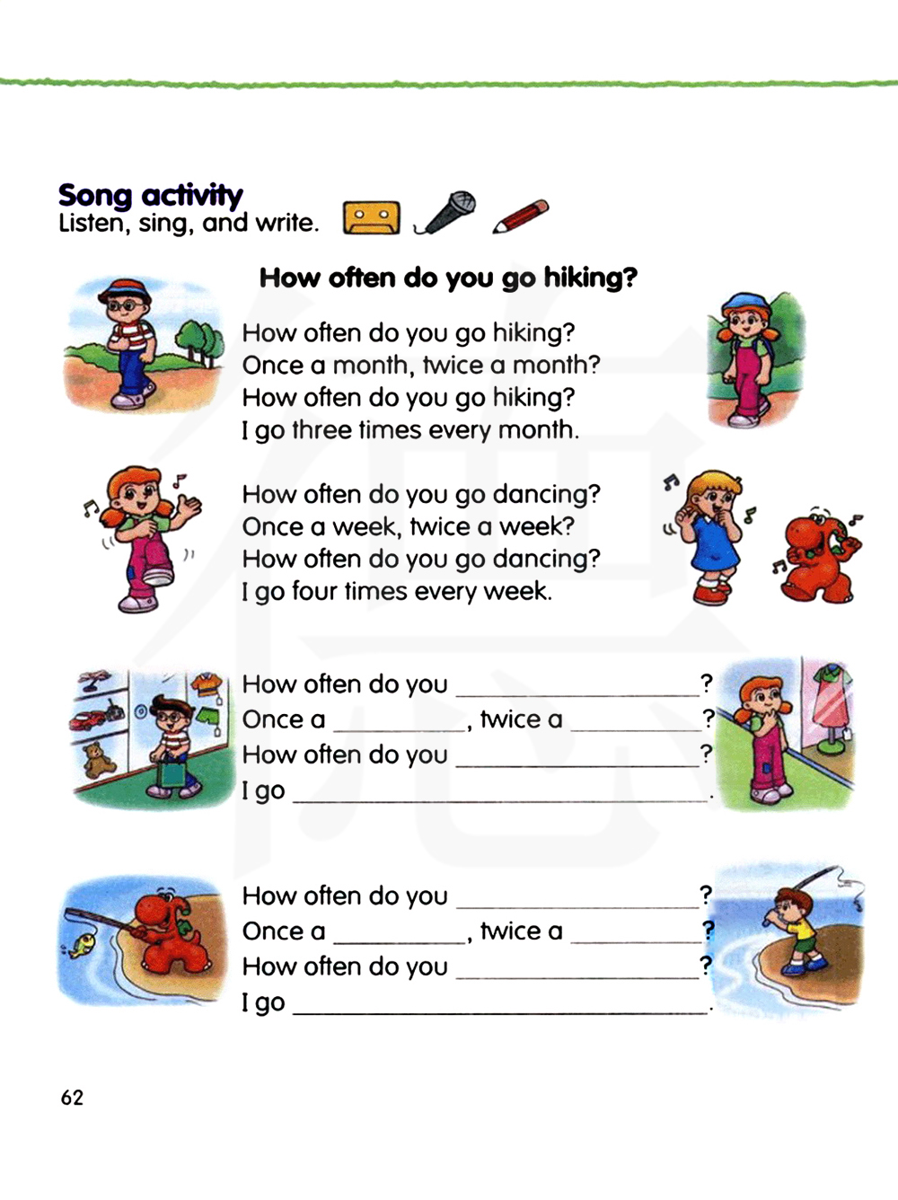 你多久去一次远足? 一个月一次,一个月两次? 你多久去一次远足? 我一个月去三次。 你多久跳一次舞? 一周一次,一周两次? 你多久跳一次舞? 我每星期去四次。(歌曲) ...