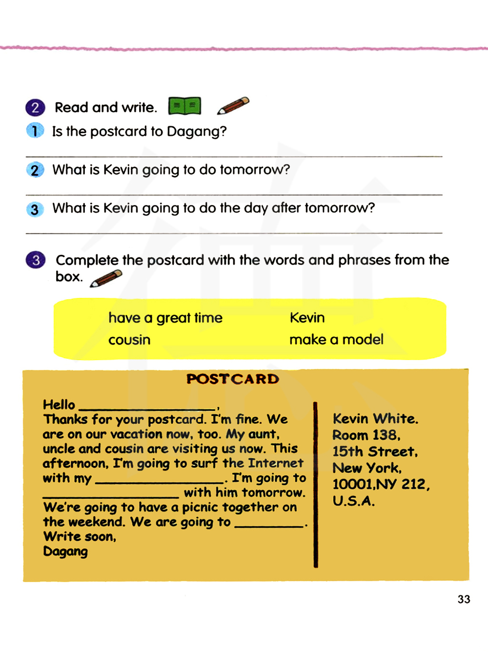 嗨,凯文 谢谢你的明信片,我很好,我们现在也在度假,我婶婶,叔叔,堂哥现在正在拜访我家,今天下午,我打算跟我堂哥上网,明天我打算和他一起做模型,