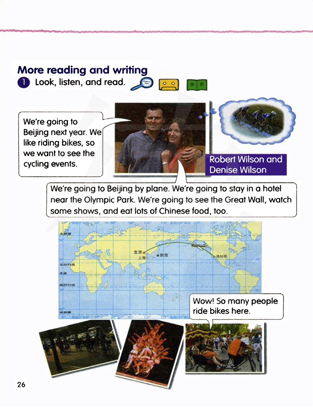我们将乘飞机去北京。 我们将住在奥林匹克公园附近的旅馆里。 我们要去爬长城、 看节目, 也要品尝很多种类的中国菜。