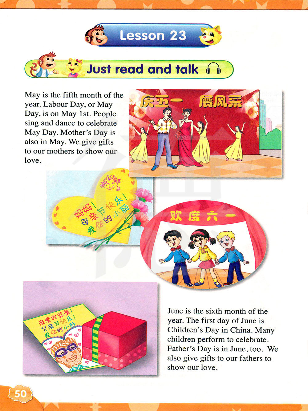 六月是一年里的第六个月。在中国六月的第一天是儿童节。很多孩子表演节目来庆祝。父亲节也在六月。我们也送礼物给父亲来表达我们的爱。