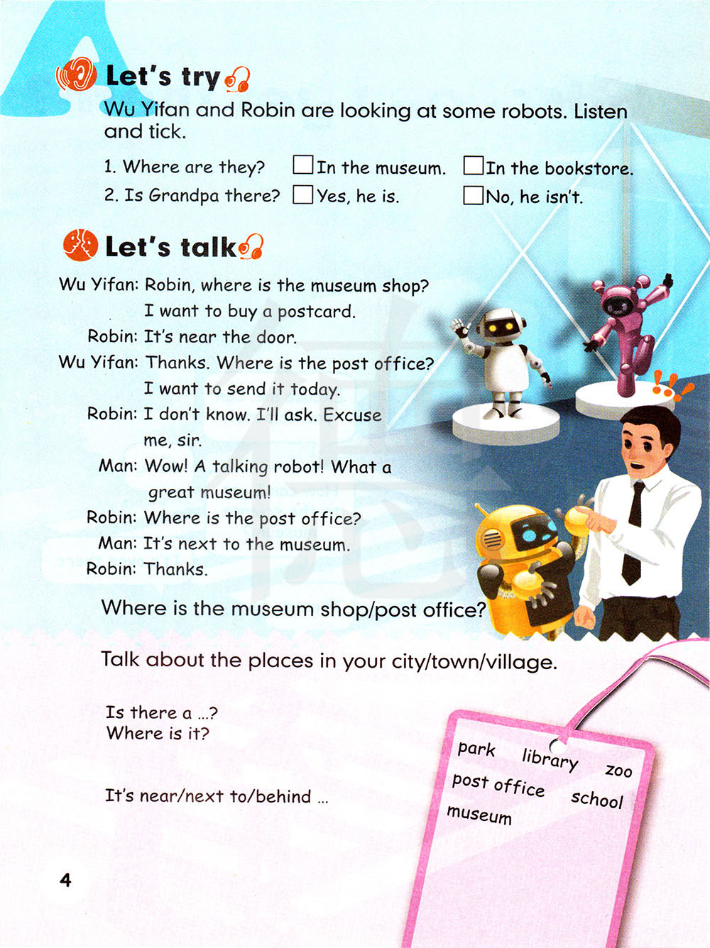 吴一凡和罗宾在看一些机器人,听一听并打勾。