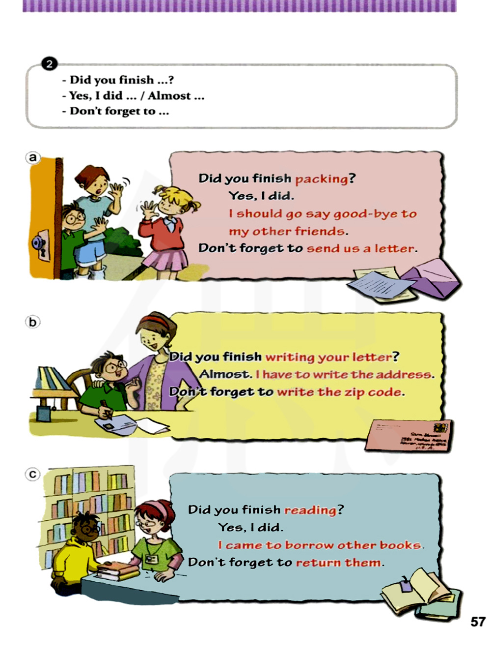 你的信写完了吗?差不多了。我得写地址。不要忘了写邮政编码。