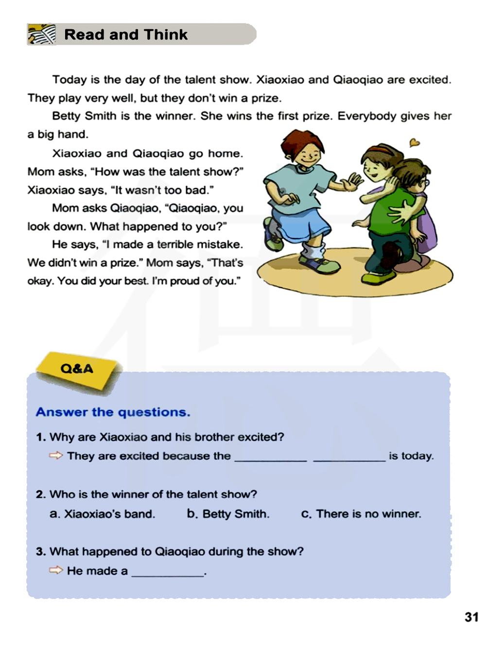 今天是才艺表演的日子。肖肖和乔乔很兴奋。他们表演得很好,但是他们没有得奖。