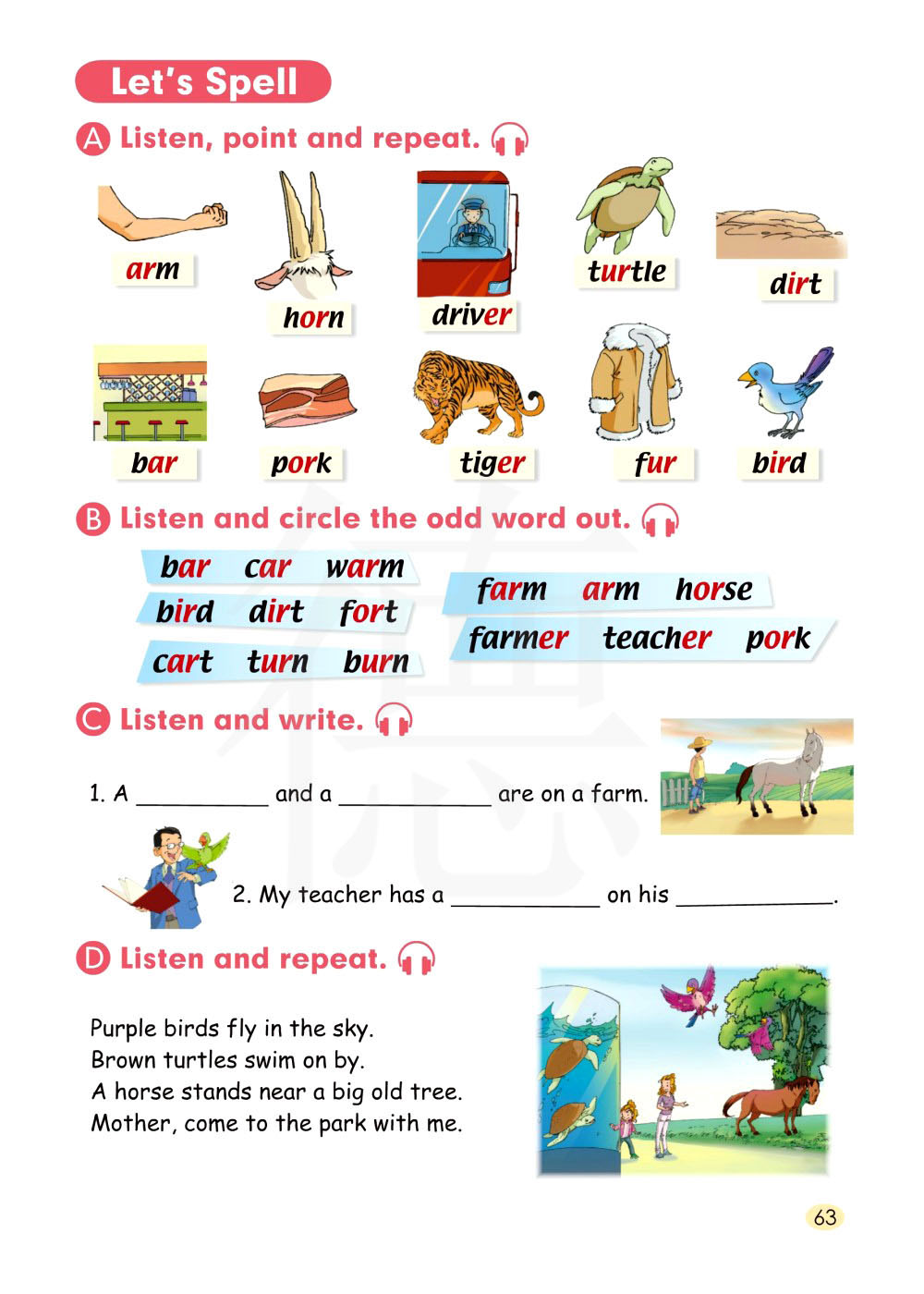 B 听一听并且圈出不一样的单词。