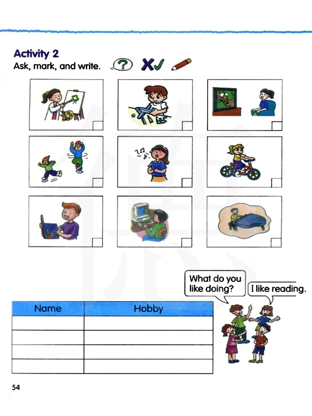问一问并在对应的方格内打勾或打叉,然后写一写。